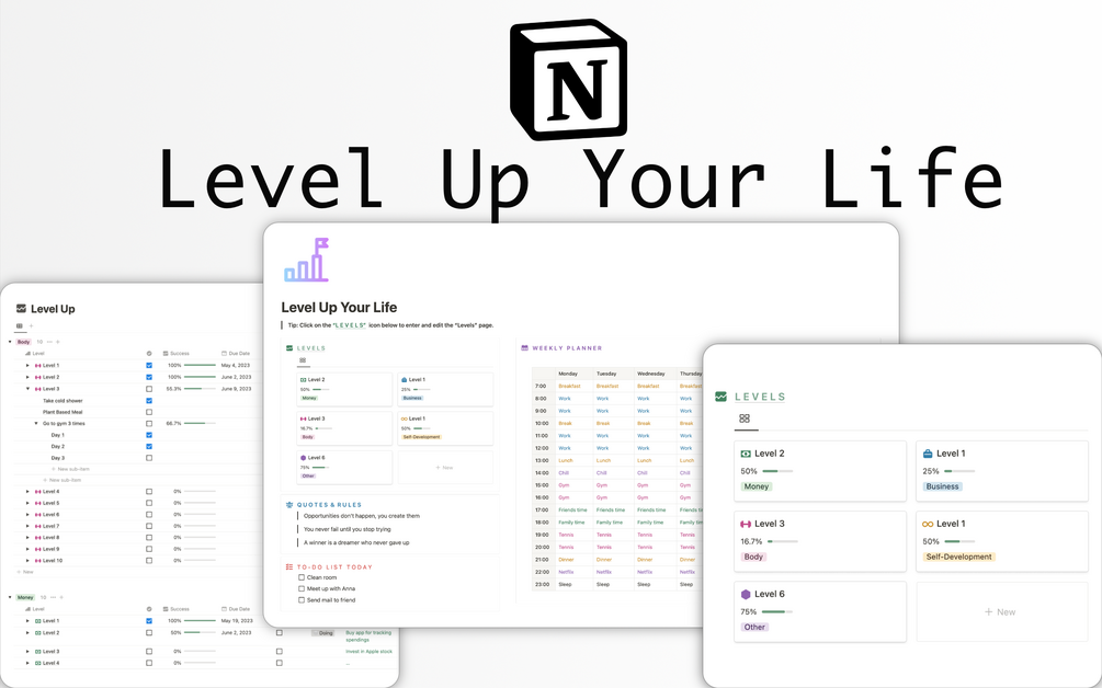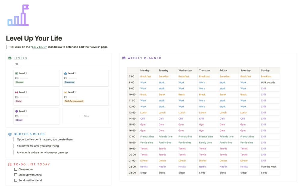 Are you tired of feeling overwhelmed by your to-do list and struggling to stay motivated? Look no further! This revolutionary productivity template is designed to transform the way you work. By infusing the power of gamification into your daily tasks, this template turns productivity into an exciting adventure. With every completed task, you'll earn points and level up in your selected areas of life, unlocking rewards and achievements along the way. Scientific research has shown that this innovative approach of gamification makes you 4 times more likely to complete your tasks. Don't miss out on this game-changing opportunity to level up your productivity and achieve your goals like never before. Get this template now and unlock a whole new world of productivity!